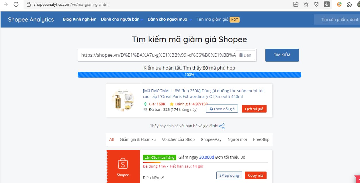 Bước 2: Vào ShopeeAnalytics.com chọn “Tìm mã giảm giá”. Dán link sản phẩm đó. Copy mã giảm giá phù hợp