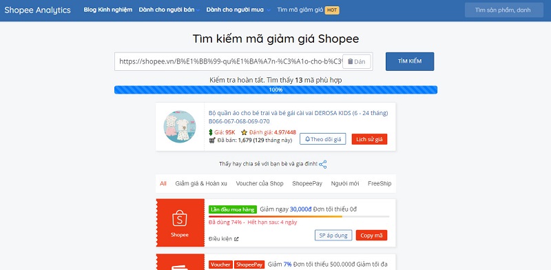 Bạn hãy tìm sản phẩm quần áo trẻ em mà bạn muốn mua trên Shopee. Sau đó, trình duyệt mã giảm giá Shopee Analytics sẽ giúp bạn tổng hợp lại toàn bộ Voucher có thể áp dụng cho sản phẩm đó. Tiến hành copy link sản phẩm theo 2 cách sau: