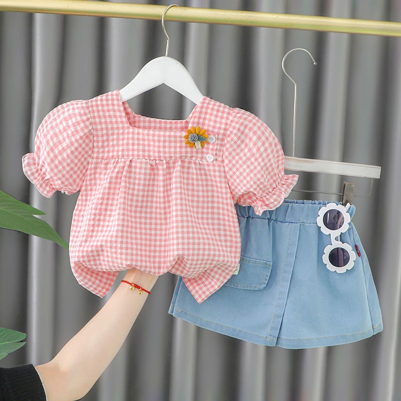 3. Set áo tay phồng ngắn kẻ sọc ca rô cùng quần short jeans dành cho bé gái