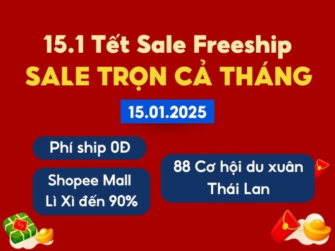 Chương trình 15.1 Tết Sale Freeship là một trong những sự kiện mua sắm lớn nhất của Shopee trong tháng 1, với hàng loạt ưu đãi hấp dẫn. Bạn sẽ được tận hưởng miễn phí vận chuyển toàn quốc, giúp việc mua sắm trở nên dễ dàng và tiết kiệm hơn bao giờ hết. Hơn thế nữa, lì xì deal giảm đến 90% sẽ mang đến cơ hội săn các sản phẩm yêu thích với mức giá cực kỳ ưu đãi. Ngoài ra, bạn còn có cơ hội nhận được 88 chuyến du xuân Thái Lan, một món quà Tết cực kỳ hấp dẫn từ Shopee.
