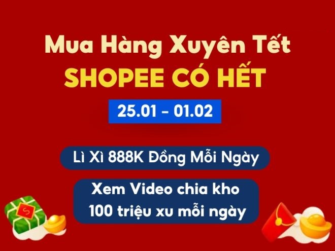 Đặc biệt, đừng bỏ lỡ cơ hội tham gia chương trình xem video chia kho 100 triệu xu mỗi ngày để tiết kiệm khi mua sắm những món đồ yêu thích. Bạn còn có cơ hội nhận lì xì lên đến 888K đồng mỗi ngày, mang lại may mắn đầu năm mới và giúp bạn mua sắm thoải mái trong dịp Tết. Cùng Shopee trải nghiệm mua sắm thả ga, vừa tiết kiệm vừa đón Tết thật vui vẻ!