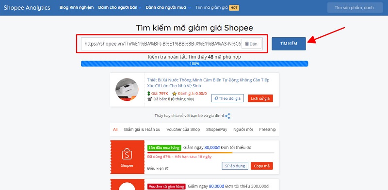 Tiếp đến, bạn dán link sản phẩm vừa lưu và nhấn Tìm kiếm là xong. Phần Trình duyệt sẽ hiện lên toàn bộ voucher, mã giảm giá mà bạn có thể sử dụng cho sản phẩm.