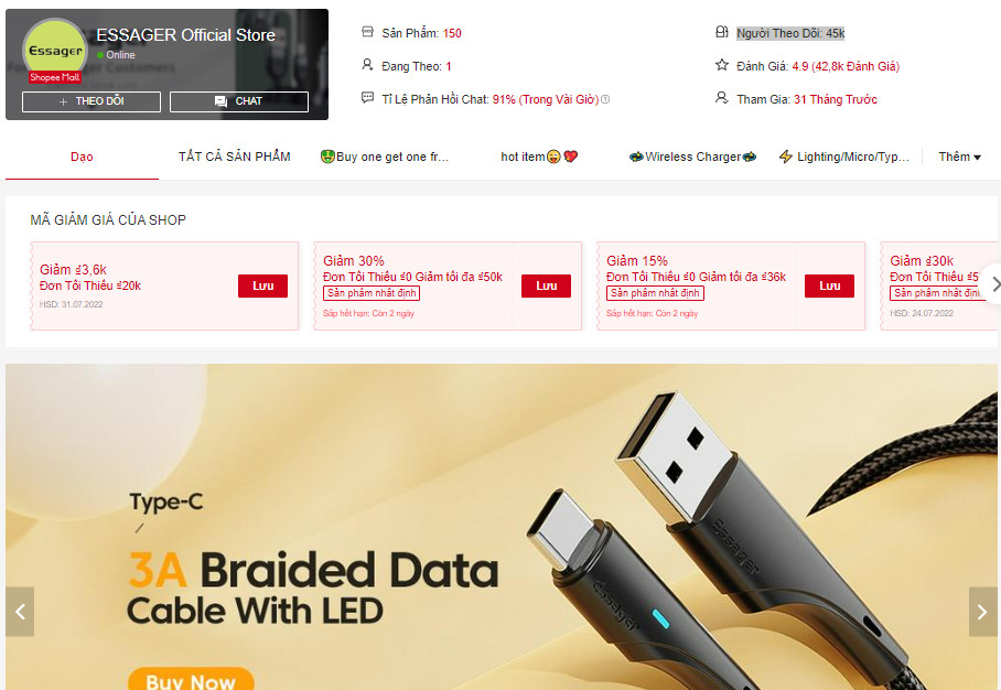 Gian hàng chính hãng ESSAGER Official Store trên Shoppee được tạo nên bởi thương hiệu phụ kiện điện thoại nội địa Trung - ESSAGER. Các sản phẩm của ESSAGER chủ yếu tập trung vào các thiết bị dây cáp sạc, sạc không dây, tai nghe các loại, cổng chuyển đổi từ điện thoại sang máy tính, giá đỡ điện thoại… dành cho các thiết bị Android và iOS. Các thiết bị trên đều là chính hãng và được cam kết về mặt chất lượng. Mức giá chỉ dao động từ 50-100k nên nếu đang tìm mua các phụ kiện điện thoại chất lượng giá tốt thì bạn nhất định phải ghé gian hàng này nhé.