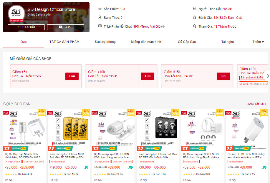 SD Design Official Store tiếp tục là một gian hàng phân phối các sản phẩm thuộc 1 thương hiệu nội địa Trung là SD Design. Tuy nhiên, kho hàng Shopee của hãng được đặt tại Hà Nội nên thời gian ship sẽ nhanh hơn.