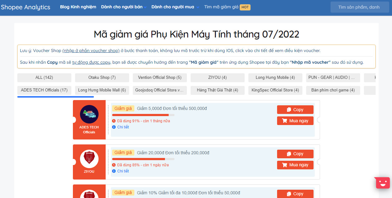 Ngoài việc truy cập đường link phía trên bạn còn có thể tìm mã giảm riêng cho từng sản phẩm phụ kiện cụ thể trên Shopee Analytics bằng cách: