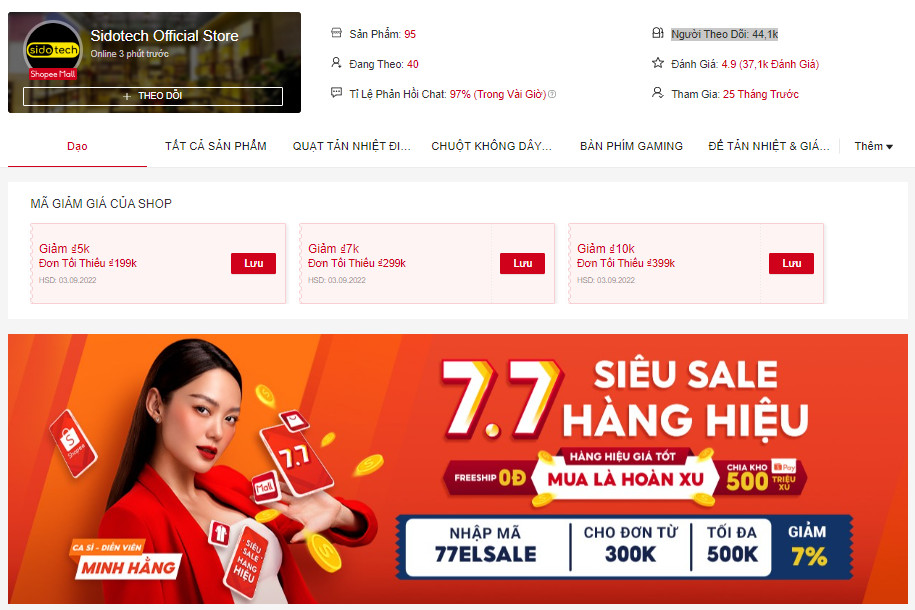 Sido Tech là một gian hàng chính hãng chuyên cung cấp các loại phụ kiện máy tính các loại được tin dùng tại Shopee. Hãng nổi tiếng với các sản phẩm chuột, bàn phím hay tai nghe chuyên dụng cho các gamer chuyên nghiệp. Trong đó, chỉ tính riêng phụ kiện chuột gaming - Sido Tech đã ghi nhận tới hàng chục nghìn lượt bán chỉ tính riêng tại sàn thương mại điện tử Shopee.