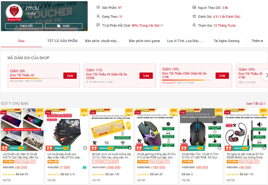 Cái tên cuối cùng trong danh sách shop bán phụ máy tính chất lượng không thể thiếu Ziyou. Gian hàng chính hãng Ziyou đem đến cho người dùng chủ yếu là các dòng phụ kiện cho người chơi game như bàn phím cơ, chuột, tai nghe. Mỗi sản phẩm đều là chính hãng và có giấy tờ đầy đủ, giá thành cũng tương đối hợp lý nên rất được nhiều người tin dùng.