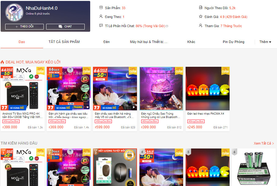 Mới ra mắt shopee đầu năm 2022, NhaDuHanh4.0 cũng đã nhanh chóng lọt top các cái tên bán hàng uy tín trên nền tảng này chỉ sau vài tháng hoạt động. Mặc dù sinh sau đẻ muộn nhưng shop này lại có phần đa dạng hơn so với hầu hết các shop bán phụ kiện TV khác. Trong đó các sản phẩm bán chạy tại đây gồm: điều khiển TV, TV Box, đèn trang trí, đèn ngủ…