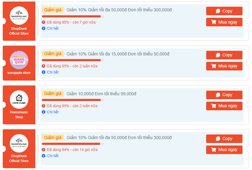 Tại mỗi mã giảm giá, chúng tôi có 2 phần cho khách hàng thao tác là “Copy mã” hoặc “Mua ngay”. Nếu bạn đã chọn được sản phẩm cần mua trước đó rồi thì có thể nhấn Copy mã sau đó đến mục thanh toán của shopee và áp mã để thanh toán. Trường hợp mới chỉ đang tham khảo shop có gì thì hãy nhấn vào “Mua ngay” nhé.