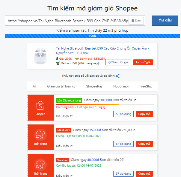 - Bước 2: Dán link sản phẩm vào ô tìm mã giảm giá tại link: https://www.shopeeanalytics.com/vn/ma-giam-gia.html để tìm mã giảm giá Shopee