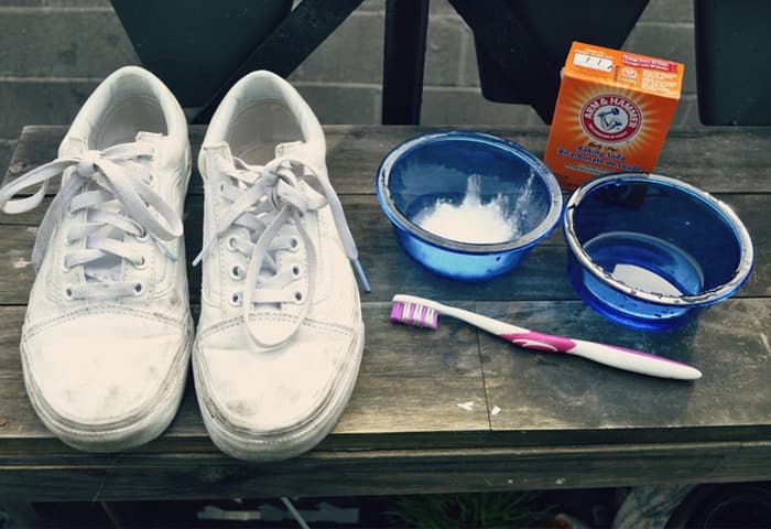 Trước tiên, bạn hãy lau giày bằng 1 miếng vải ẩm, sau đó chà kem đánh răng lên vết bẩn, chờ khoảng 10 phút. Cuối cùng chỉ cần lau sạch giày bằng khăn ướt là xong. Đảm bảo sau khi phơi xong giày sẽ trắng sáng như mới.