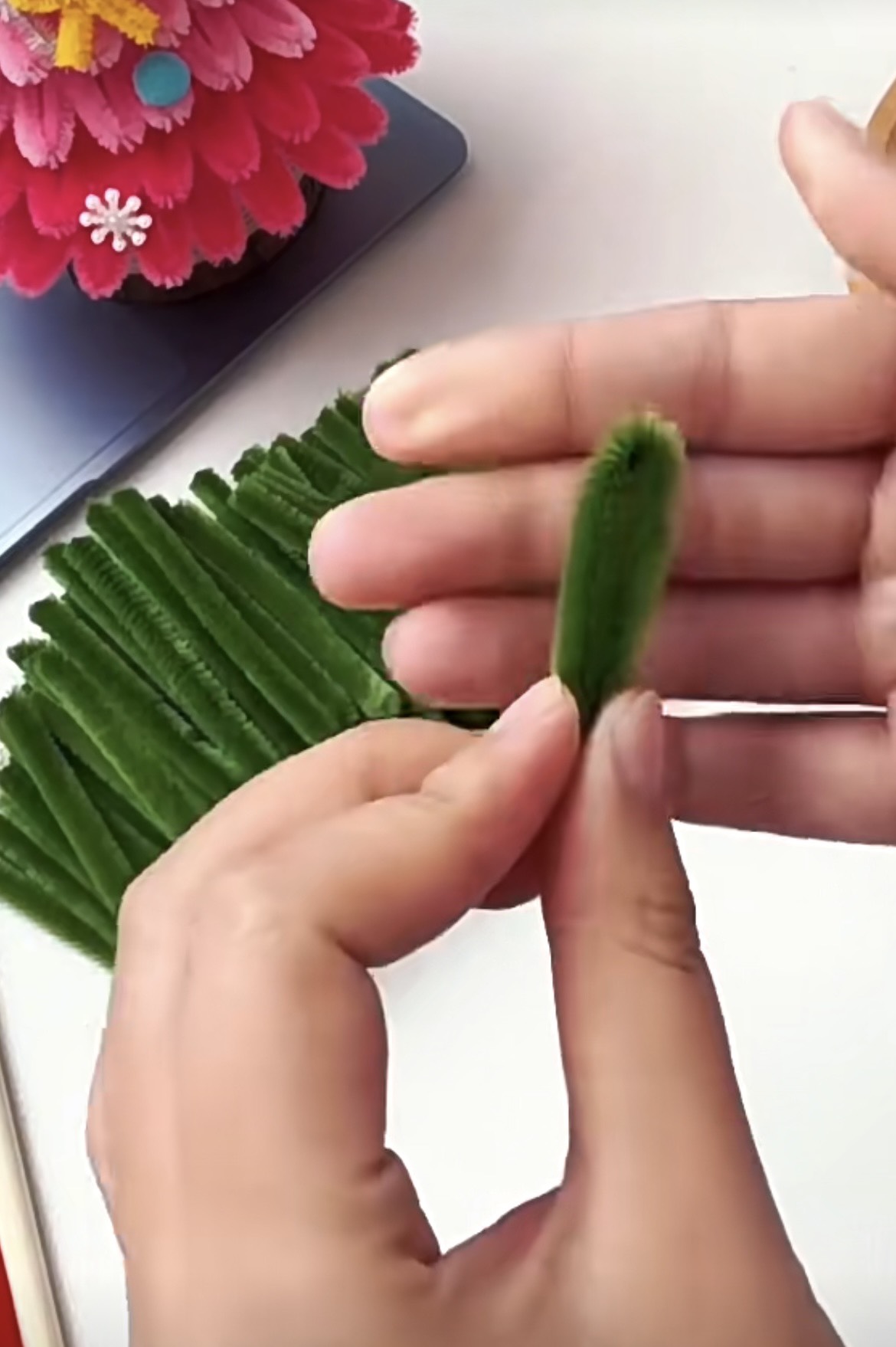 - Làm lá: Lấy dây kẽm nhung màu xanh lá, cắt thành 4 khúc. Gập đôi các phần dây kẽm này lại là được. Nhớ miết lại để dây kẽm cố định nha.