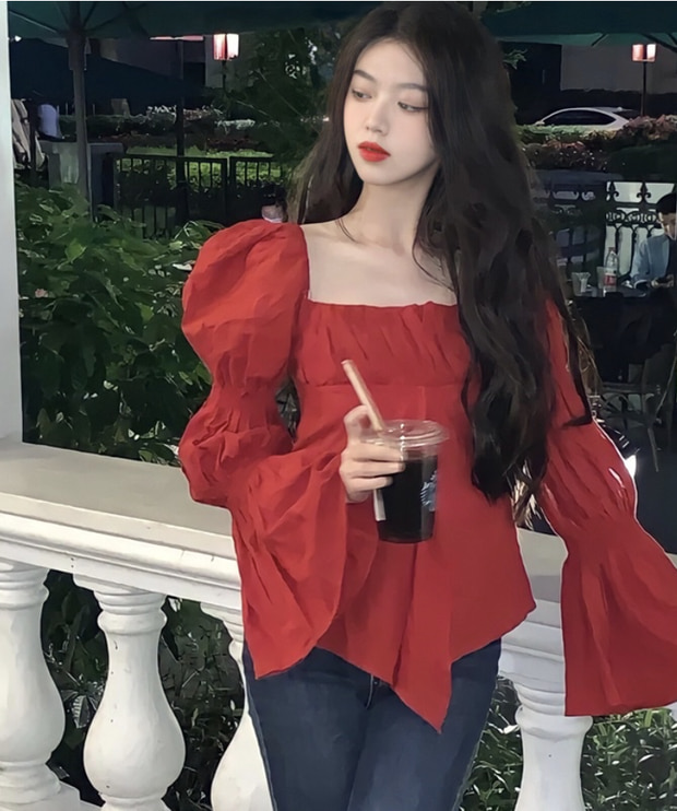 Áo kiểu đỏ tay phồng dài cổ vuông xẻ tà