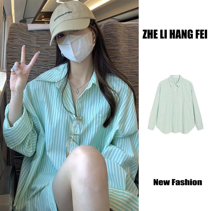 Áo sơ mi ZHELIHANGFEI tay dài chống nắng dáng rộng họa tiết kẻ sọc phong cách thời trang