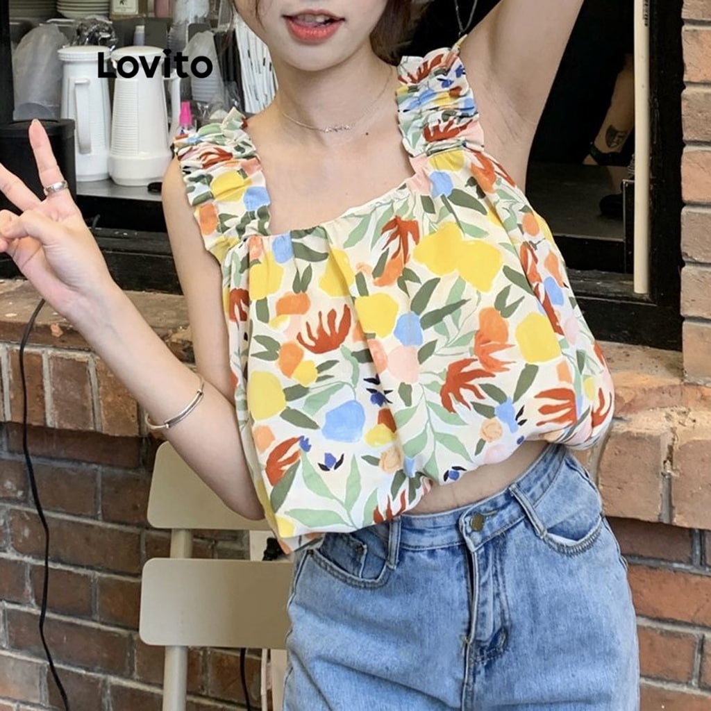 Áo dây Lovito không tay cổ vuông phối xếp nếp họa tiết hoa
