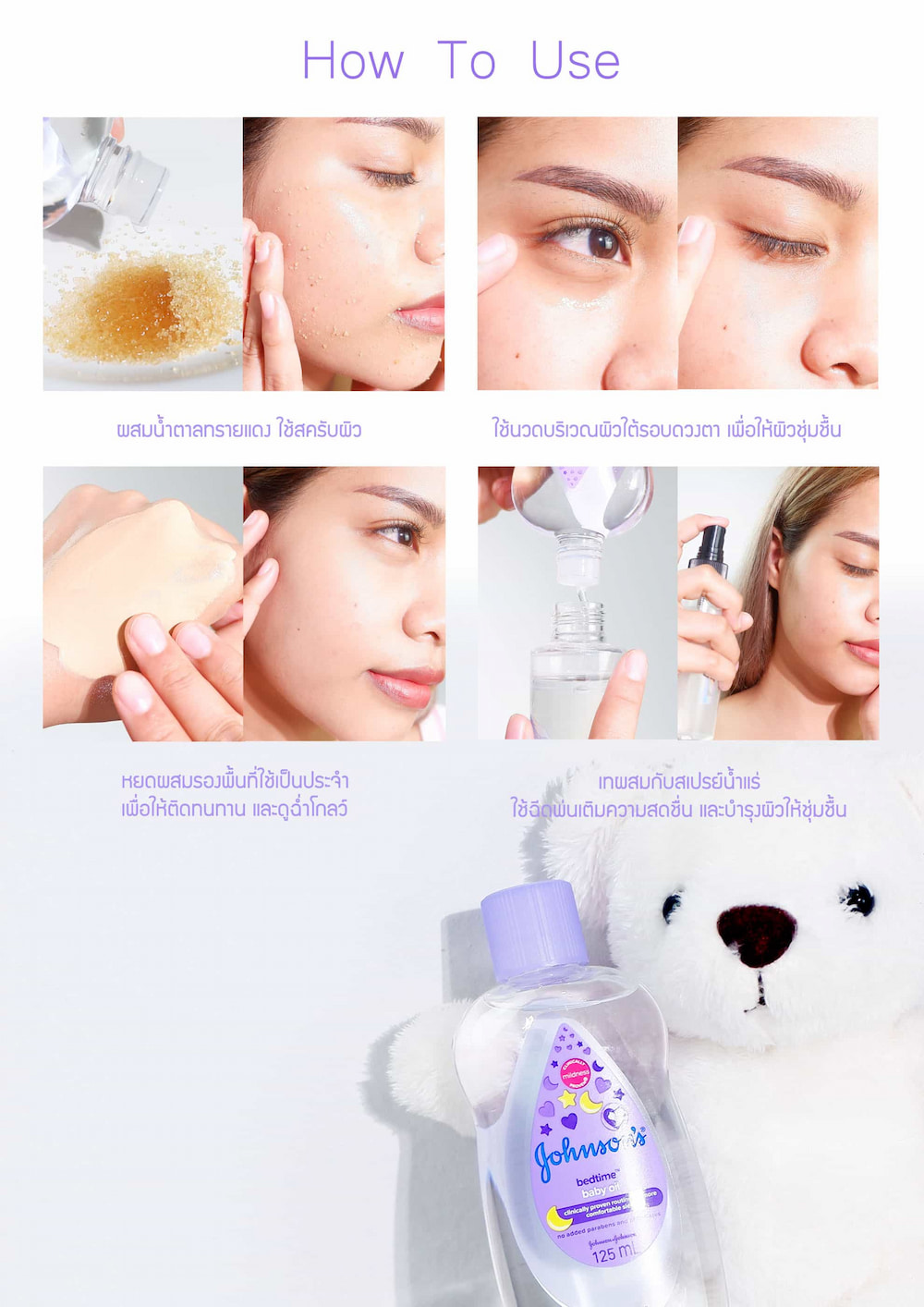 - Hỗ trợ tẩy tế bào chết cho da: Trộn dầu em bé Johnson's Baby với một ít đường đen, bã cà phê hoặc sản phẩm tẩy tế bào chết bất kỳ mà bạn đang sử dụng. Vậy là bạn đã có ngay một hỗn hợp tẩy tế bào chết hiệu quả cho cả vùng da cơ thể và da môi.