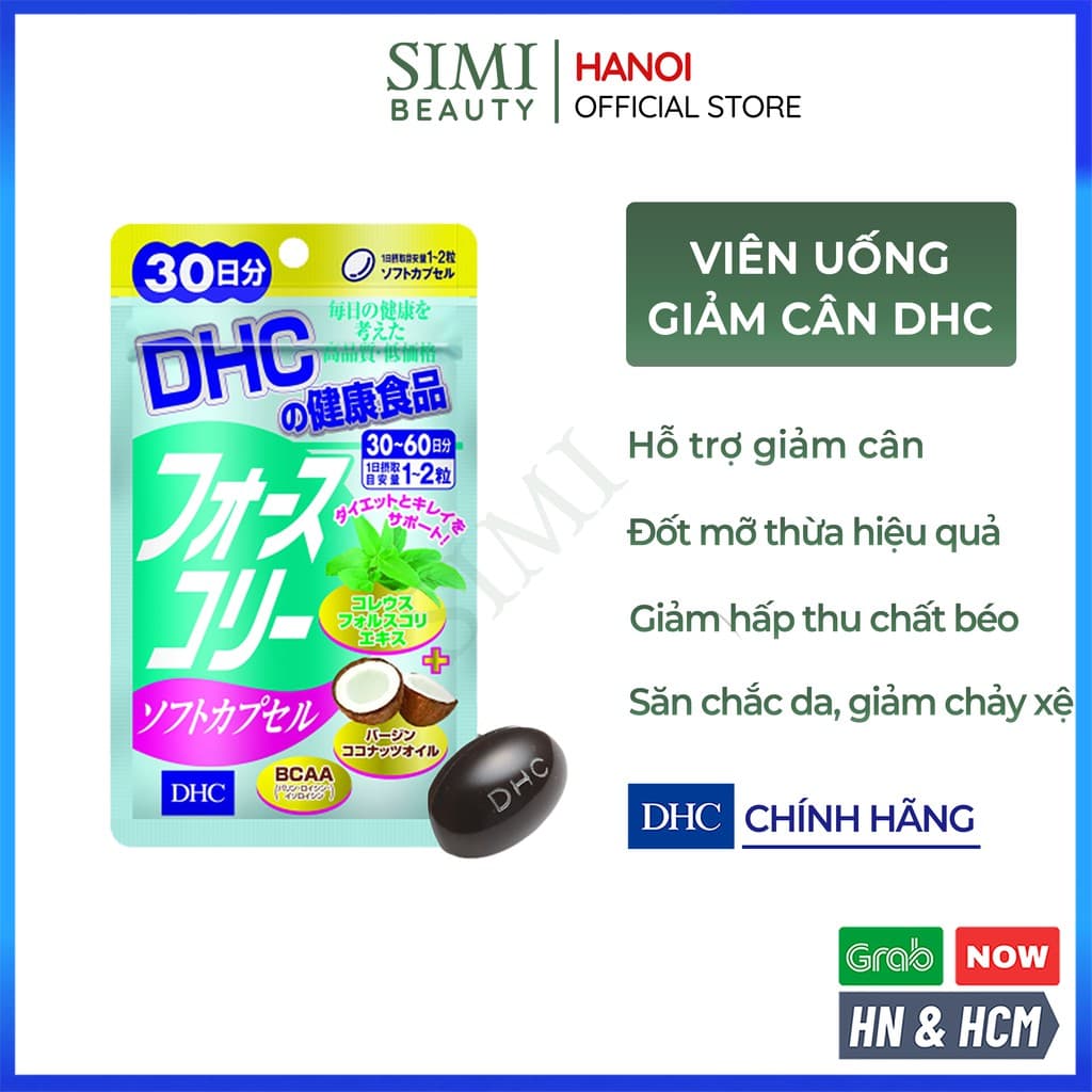 - Công dụng: Viên uống giảm cân DHC tác động giúp thúc đẩy sự phân hủy của chất béo đốt cháy mỡ thừa vùng bụng, thích hợp với người muồn giảm béo bụng mà không làm mệt mỏi cơ thể. Cung cấp vitamin cho cơ thể có năng lượng; giảm cảm giác thèm ăn, đốt cháy calore.