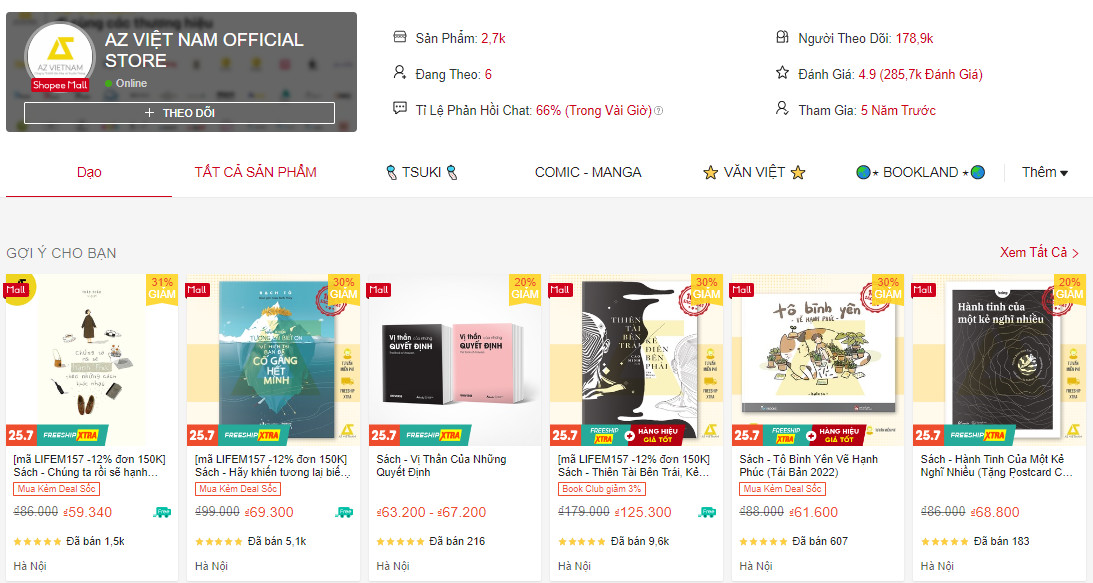 AZ VIỆT NAM được thành lập vào năm 2015 tiền thân là một đơn vị cung cấp thiết bị văn phòng phẩm, sách cho các thư viện và trung tâm đọc trên toàn quốc. Chỉ 2 năm sau đó, đơn vị này đã chính thức chào sân Shopee và trở thành số ít các nhà sách có bề dày kinh nghiệm trên nền tảng này. Số lượng sách mà đơn vị này bán ra ước tính xấp xỉ trên dưới 500k sản phẩm - 1 con số tương đối khủng so với nhiều tên tuối lớn.