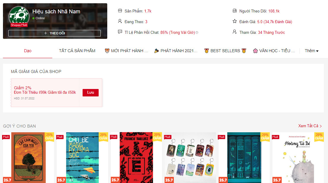 Mặc dù có mặt tại thị trường khá lâu song phải tới cuối năm 2019, đơn vị này mới ra mắt tại sàn thương mại điện tử Shopee. Sau một thời gian đủ lâu để phát triển, tới nay Nhã Nam đã thu về cho mình hơn 108k lượt theo dõi cùng tỉ lệ đánh giá tuyệt đối là 5.0/5* (trong 34.7k lượt đánh giá).
