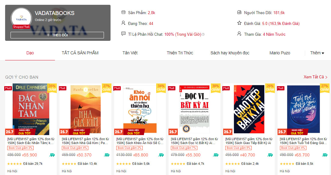 Giống như Fahasa, VADATA BOOKS cũng là một địa chỉ chuyên cung cấp sách được sản xuất bởi rất nhiều nhà xuất bản khác nhau. Tuy không có hệ thống cửa hàng hoành tráng, trải khắp như Nhã Nam hay Fahasa nhưng gian hàng chính hãng của thương hiệu trên Shopee lại tỏ ra không hề thua kém.