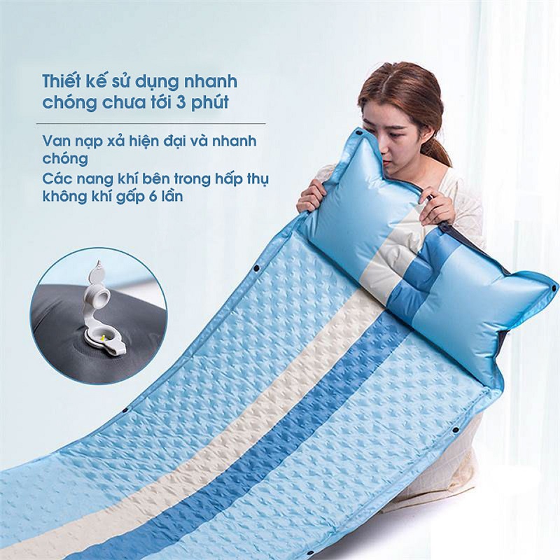 Một chiếc đệm tiện lợi, hữu ích mang theo khi đi cắm trại để đảm bảo giấc nghỉ cho chúng ta một cách ngon lành và an toàn nhất. Chiếc đệm này không chỉ dành cho dã ngoại, cắm trại mà còn có thể dùng trong văn phòng nữa. Chiều dài của nó là 2m khá thoải mái, rộng rãi cho 1 người sử dụng với thiết kế là công nghệ mới có nệm hơi và mút cao su, lõi bông mềm mại, không bị rò rỉ khí. Khi không dùng đến gấp gọn lại chỉ còn 30 x 10cm, rất tiện lợi và dễ mang vác.