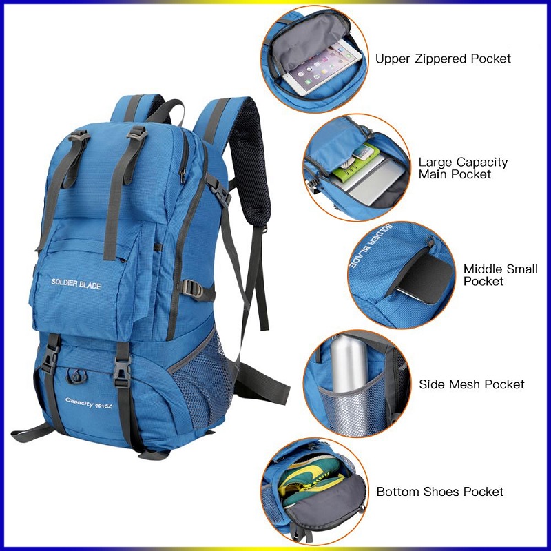 Balo không thấm nước, dung tích lên tới 45L, được làm bằng chất lượng cao cấp, có 5 màu cho các bạn lựa chọn: xanh lá cây, xanh lam, đen, đỏ và xanh lá cỏ. Balo có khóa điều chỉnh, bạn có thể điều chỉnh sao cho phù hợp với form người của bạn. Đương nhiên nó sẽ có nhiều ngăn cho bạn đựng đồ. Balo này không chỉ dành cho cắm trại mà còn phù hợp cho buổi leo núi nữa.