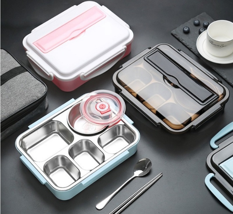 - Hộp có thiết kế nhỏ gọn với 1 ngăn lớn, 2 ngăn nhỏ, kèm theo bộ thìa đũa inox cao cấp.