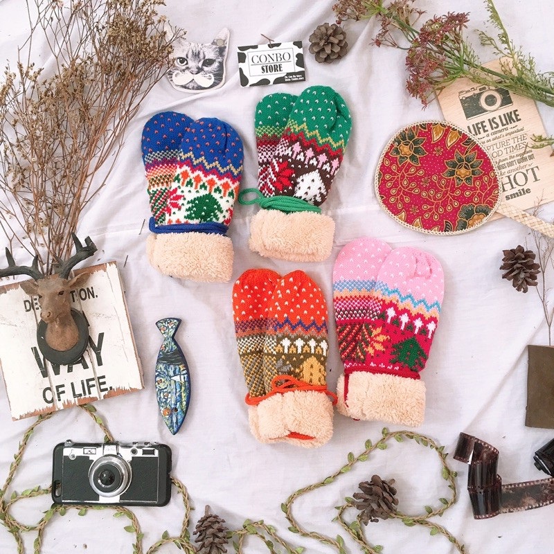 Mũ len, áo khoác len thì không thể nào thiếu được găng tay len rồi đúng không nào? Đây sẽ là phụ kiện nữ vừa hợp không khí Noel, vừa giữ ấm cho tay bạn. Những chiếc găng tay mang họa tiết như tuần lộc, cây thông giáng sinh hay hoa tuyết như thế này chắc chắn sẽ làm bạn thật nổi bật giữa mùa đông này đấy. Màu sắc tươi tắn thu hút khiến bạn nhìn không rời mắt cùng với họa tiết được sắp xếp như họa tiết thổ cẩm tạo được cảm giác gần gũi, đơn giản.