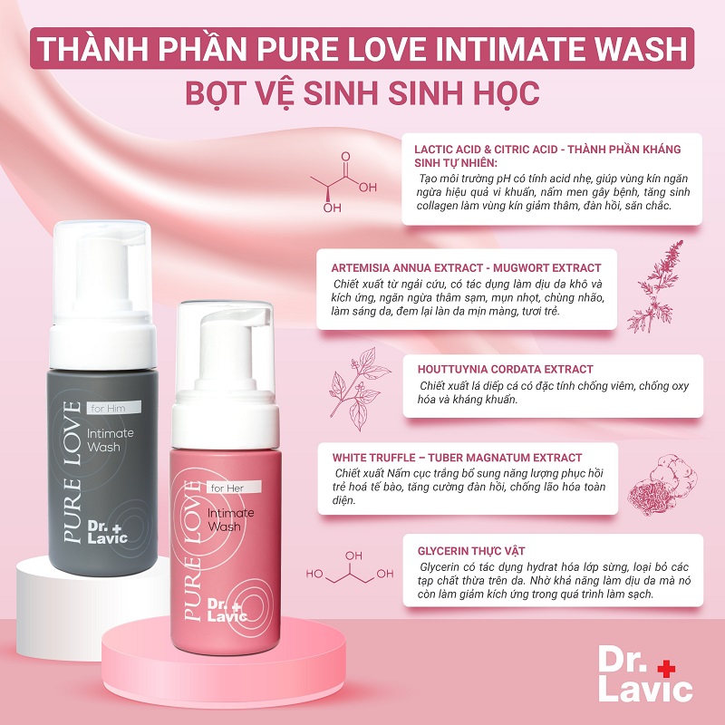 Dung dịch Dr.Lavic Pure Love Intimate Wash For Him là một sản phẩm chuyên dụng để vệ sinh nam được thiết kế từ hàn quốc với các thành phần chính như ngải cứu, diếp cá, nấm cục trắng…nên nó có thể rửa sạch và cân bằng độ ẩm cho vùng kín của bạn. Đặc biệt với mùi hương nam tính nó sẽ giúp cho cánh màu râu có một buổi quan hệ đôi lứa thăng hoa nhất.