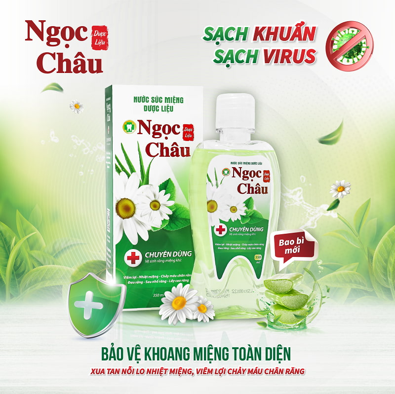 Nước súc miệng dược liệu Ngọc Châu được sản xuất theo dây chuyền công nghệ tiên tiến và được nghiên cứu bởi các chuyên gia nha khoa. Sản phẩm giúp làm dịu khoang miệng, giảm dấu hiệu sưng đỏ, xót của nhiệt miệng, viêm lợi, chảy máu chân răng. Sản phẩm có vị dược liệu thơm mát, nhẹ nhàng và nhanh chóng làm dịu khoang miệng, phù hợp với những người đang hoặc bị tổn thương trong khoang miệng. Đây là sản phẩm chuyên dùng khi bị viêm lợi, nhiệt miệng, đau răng, sau khi nhổ răng hoặc lấy cao răng.