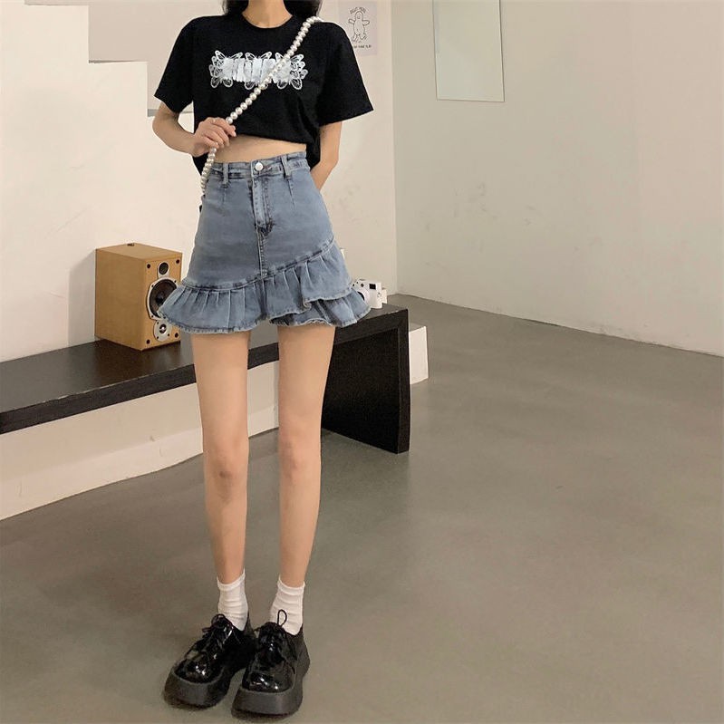 5. Chân váy jean dáng ngắn xòe xếp ly retro WANAWEAR