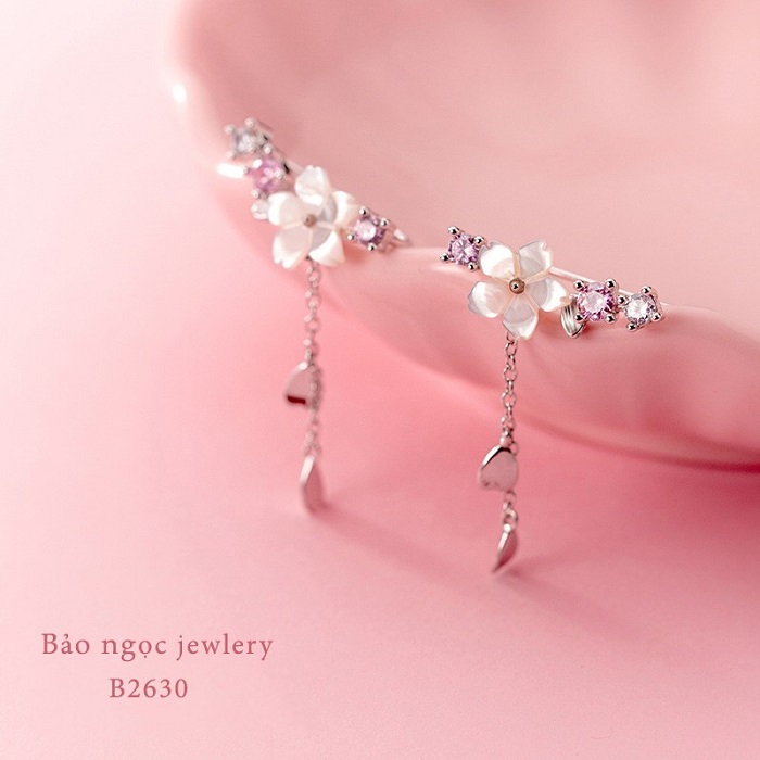 - Khuyên tai bạc nữ dáng dài hình bông hoa 5 cánh đính đá