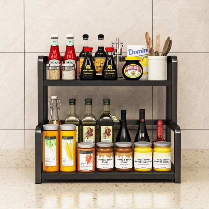- Công dụng: Kệ có 2 tầng rộng rãi, tiện lợi trong việc sắp xếp hũ gia vị, nước tương, dầu ăn, nước mắm,... giúp căn bếp trở nên gọn gàng hơn.