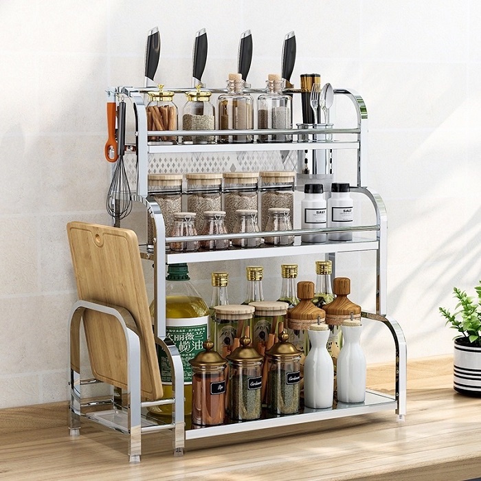 Kệ gia vị được thiết kế và sản xuất bằng chất liệu inox cứng cáp, chắc chắn, tạo nên cho không gian bếp sự tiện nghi, sang trọng nhất. Kệ có 2, 3 tầng tùy thuộc vào nhu cầu và sở thích mà các bạn có thể lựa chọn cho phù hợp. Ưu điểm của kệ inox không gỉ này là giúp giải quyết triệt để vấn đề sắp xếp đồ dùng, tạo không gian sống gọn gàng, thẩm mỹ.