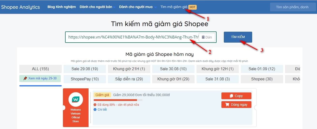 - Bước 2: Vào shopeeanalytics.com dán link sản phẩm bạn đã copy vào ô tìm kiếm để săn mã giảm giá.