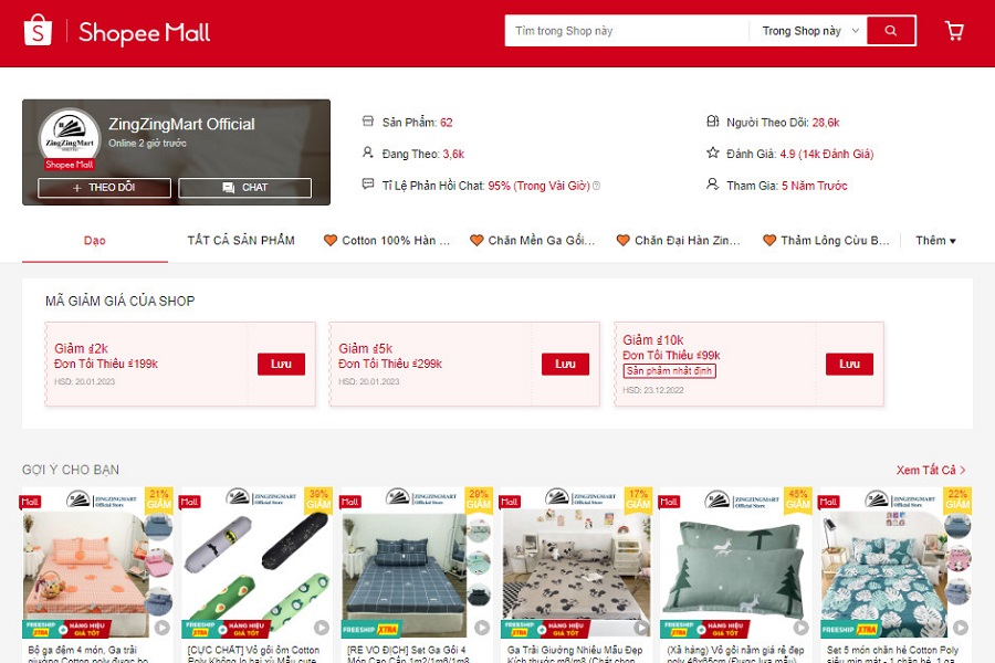 ZingZingMart Official là cửa hàng phân phối sỉ lẻ các loại từ chăn ga gối đệm đến thảm lông cừu hoặc gối ôm, gấu bông cho bạn. Shop với những sản phẩm được làm từ cotton giúp bạn dễ ngủ ngon đem lại sự thoải mái và thư giãn cho bạn. Ngoài ra shop có nhiều mã ưu đãi trên Shopee, bạn hãy nhanh tay lưu về nhiều mã giảm giá để áp dụng cho đơn đặt hàng chăn ga gối đệm với giá rẻ nhất.