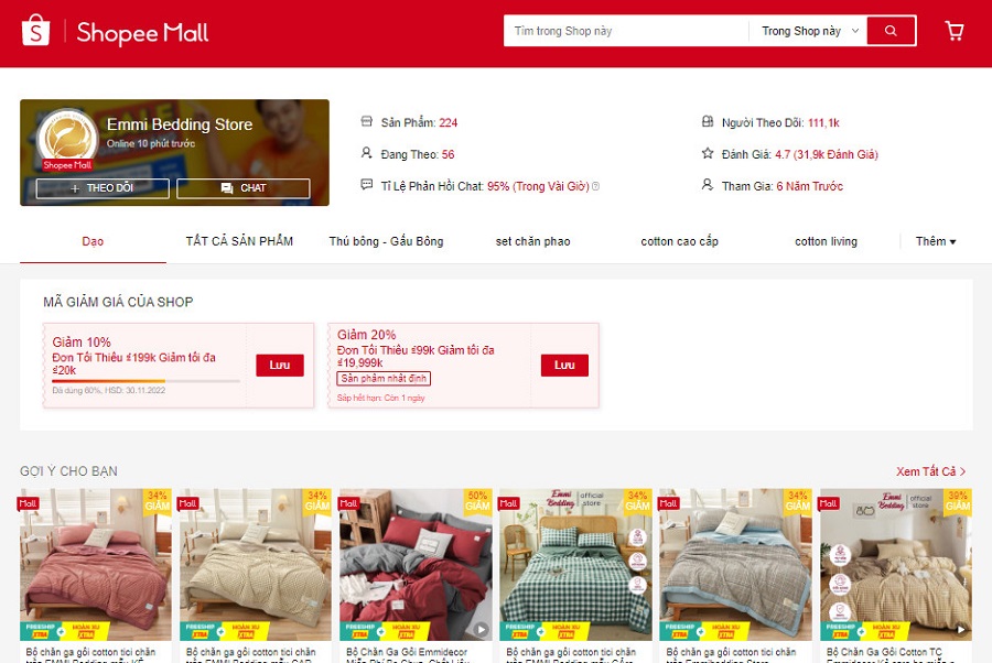 Emmi Bedding Store với nhiều sản phẩm chăn ga gối đệm từ chất liệu cotton cao cấp và cotton living, bên cạnh đó store còn cung cấp một số mặt hàng từ chăn phao, thú bông và thảm các loại cho bạn tham khảo và mua sắm. Để được áp dụng nhiều ưu đãi giảm giá sốc trên Shopee, bạn hãy đặt chung nhiều sản phẩm tại shop để được giảm giá cho đơn đặt hàng nhiều nhất nhé.