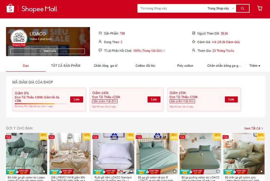 Lidaco là nơi bán đủ loại chăn ga gối đệm với nhiều chất liệu như poly cotton và nhiều loại chăn chần, chăn lông đẹp mắt. Cửa hàng với nhiều kiểu dáng và màu sắc đẹp, sang trọng sẽ khiến bạn thư giãn thoải mái để có giấc ngủ ngon sau một ngày làm việc mỏi mệt. Đặc biệt shop còn có nhiều mẫu chăn ga gối đệm với chất liệu lụa mềm mịn mát lạnh và thấm hút mồ hôi cực hiệu quả. Hãy tham khảo nhiều mẫu hàng hoặc nhắn tin cho shop để được tư vấn và hỗ trợ lựa chọn mẫu chăn ga gối đệm trên Shopee bạn nhé.