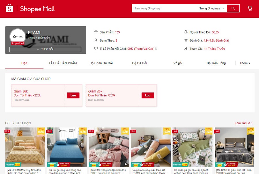 Etami là địa chỉ uy tín trên Shopee phân phối các loại chăn ga gối đệm của người lớn và trẻ nhỏ. Chăn ga gối đệm với nhiều họa tiết đẹp mắt giúp bạn thư giãn và thả lỏng khi đặt lưng lên, dễ dàng chìm vào giấc ngủ ngon. Shop được nhiều người dùng ưa chuộng và yêu thích trên Shopee, bạn hãy lựa chọn ngay sản phẩm ưng ý và thêm vào giỏ hàng để mua sắm với giá rẻ ngay nào.