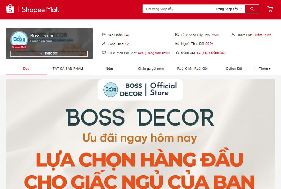 Một địa chỉ cửa hàng uy tín bạn không thể bỏ lỡ khi đang tìm chọn chăn ga gối đệm trên Shopee. Boss Decor đang được đánh giá cao bởi người dùng bởi chất lượng, giá rẻ cùng với nhiều mẫu mã chăn ga gối đệm đẹp. Shop cung cấp nhiều loại chăn ga gối đệm với chất liệu cotton đũi, cotton 3F, cotton Tici,... kèm một số sản phẩm khác để bạn mua sắm cùng. Nếu bạn đã tìm được sản phẩm chăn ga gối đệm ưng ý tại shop, hãy lên đơn đặt hàng để shop hỗ trợ ship hàng nhanh nhất đến tay cho bạn.