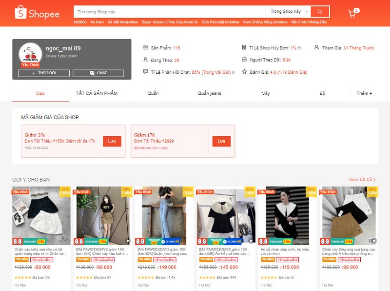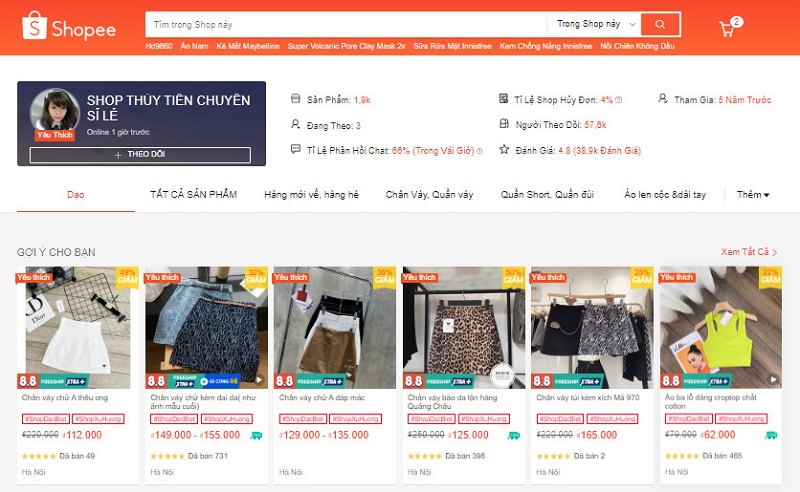 Shop Thủy Tiên chuyên sỉ lẻ các mặt hàng thời trang giá rẻ và luôn tuyển khách sỉ, cộng tác viên trên toàn quốc. Shop tham gia từ 5 năm trước, hiện tại số người theo dõi của Shop là 57,6K và đánh giá 4.8* tương đương với 38,8K đánh giá từ người dùng.