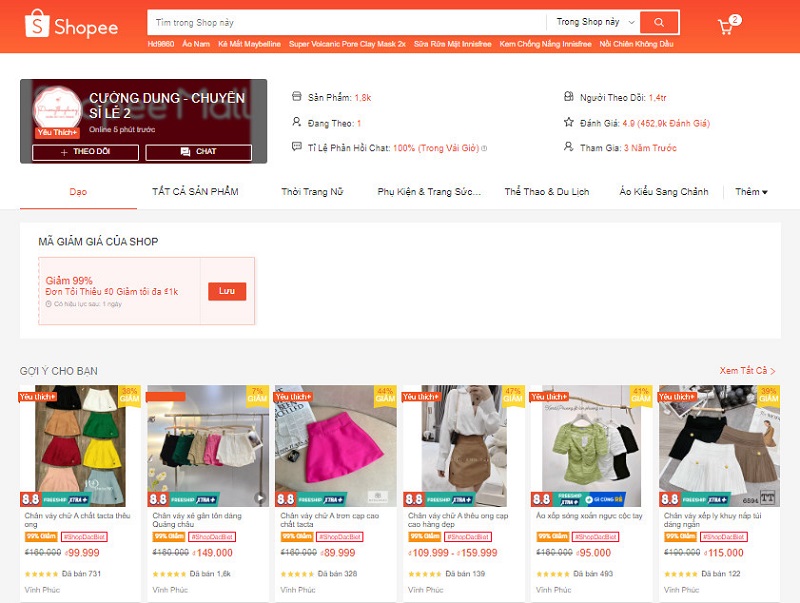 Cường Dung - Chuyên sỉ lẻ 2 có lượt theo dõi cực khủng 1,4tr chỉ trong vòng 3 năm tham gia bán hàng trên Shopee. Shop được đánh giá 4.9* tương đương 452,4K lượt đánh giá. Bên cạnh đó, Shop có rất nhiều sản phẩm cho bạn lựa chọn như chân váy, áo croptop, phụ kiện, trang sức nữ,...