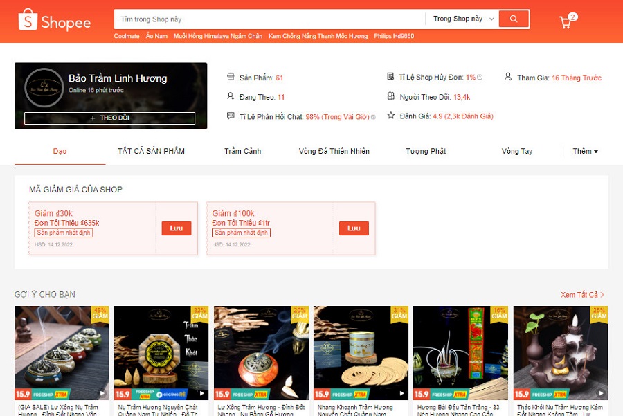 Bảo Trầm Linh Hương là thương hiệu Trầm Hương Quốc Gia, thương hiệu luôn tự tin cho ra những sản phẩm chất lượng cao cấp và luôn đổi mới mỗi ngày. Trầm hương có ý nghĩa sâu sắc trong quan niệm nhân sinh, phong thủy của người Phương Đông. Ngoài bán lư xông trầm, Bảo Trầm Linh Hương còn bán những sản phẩm khác như trầm cảnh, vòng đá thiên nhiên, tượng Phật, trầm cao cấp,... Shop được đánh giá 4.9* và tích lũy được 13,3K người theo dõi trong vòng 16 tháng.