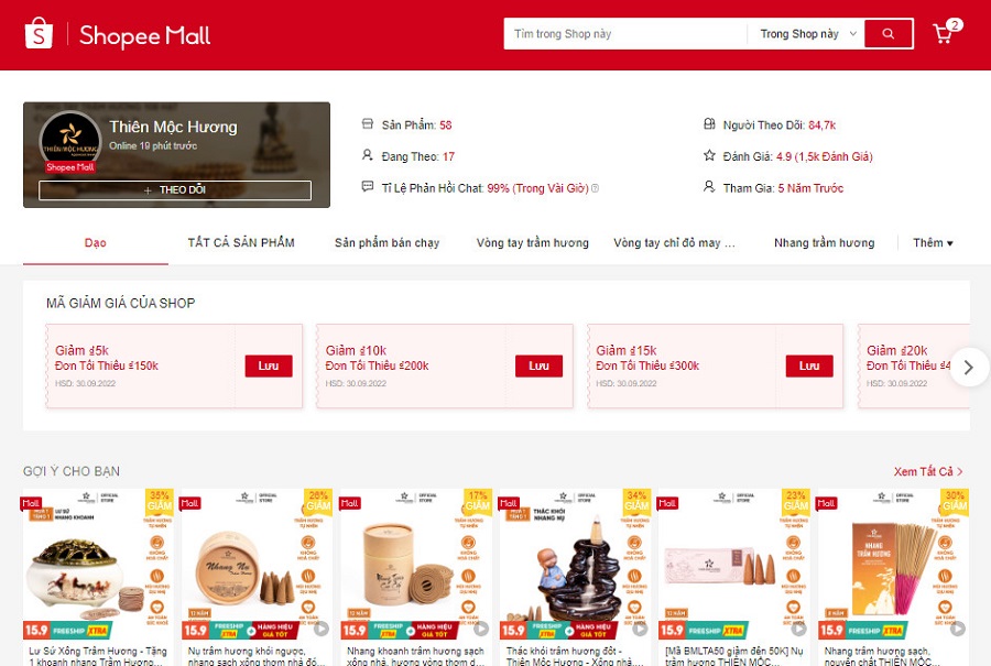 Thiên Mộc Hương là thương hiệu cao cấp, nổi tiếng về các sản phẩm trầm hương như lư xông trầm hương, vòng tay trầm hương, nhang trầm hương, phụ kiện trầm hương và vòng tay chỉ đỏ. Có thể thấy, hầu hết các sản phẩm tại Shop đều được làm từ trầm hương và đây là một trong những Shop uy tín nhất để bạn lựa chọn làm địa chỉ mua trầm hương về sử dụng cho gia đình. Với kinh nghiệm bán hàng trên Shopee được 5 năm, Shop đã đạt 4.9* đánh giá tổng quan và thu về được 86,3K người theo dõi gian hàng.