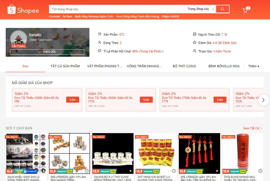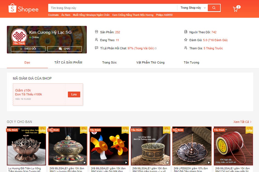 Đây là đơn vị chuyên cung cấp sỉ, lẻ các vật dụng phong thủy, thờ cúng tâm linh. Gian hàng có câu phương châm “Khách hàng là thượng đế” vì mong muốn nhận được sự tương tác nhiệt tình từ phía người dùng. Giá của các sản phẩm không khuyến mãi nhưng chất lượng sản phẩm thực sự tốt và có tính cạnh tranh cao. Gian hàng còn hỗ trợ đổi trả nếu lỗi do nhà sản xuất hoặc không vừa ý khách hàng.