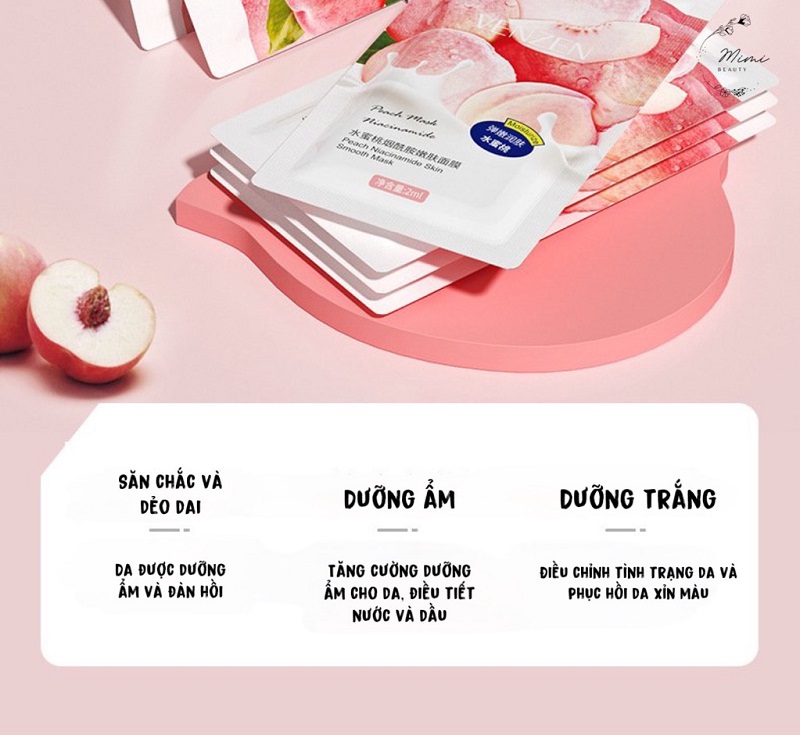 Mặt nạ với dưỡng chất da chiết xuất từ đào chứa niacinamide sẽ có thể giúp bạn có một làm da mịn màng với tác dụng có thể dưỡng ẩm, cấp nước một cách tốt nhất. Đặc biệt sản phẩm vô cùng lành tính cho da, bạn không cần phải rửa lại dưỡng chất sau khi sử dụng như các loại mặt nạ khác.