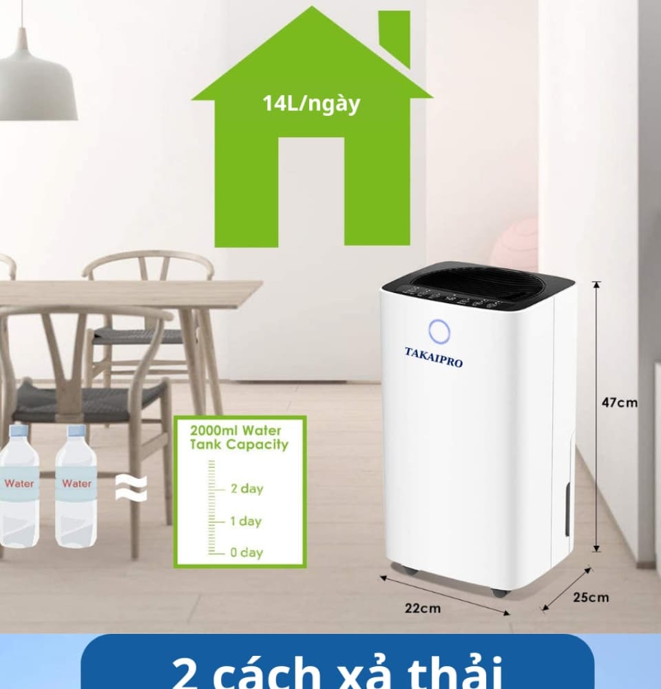 Máy hút ẩm TAKAIPRO có khả năng hút ẩm lên đến 14:/ngày, máy sử dụng được trong phòng có diện tích 50m2, hệ máy nén cao cấp bền bỉ có độ bền trên 10 năm, chức năng vừa hút ẩm vừa lọc không khí, cài đặt được độ ẩm mong muốn, phím cảm ứng dễ sử dụng, màn hình led theo dõi độ ẩm.