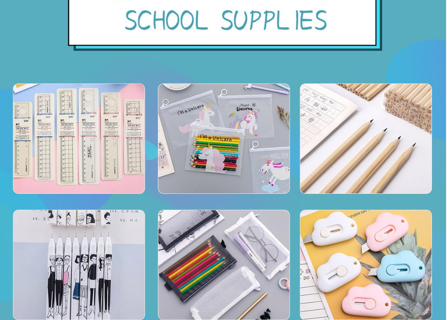 - Phụ kiện học tập: hộp bút, tẩy điện, bút xóa, thước kẻ, keo dán, kẹp bấm….