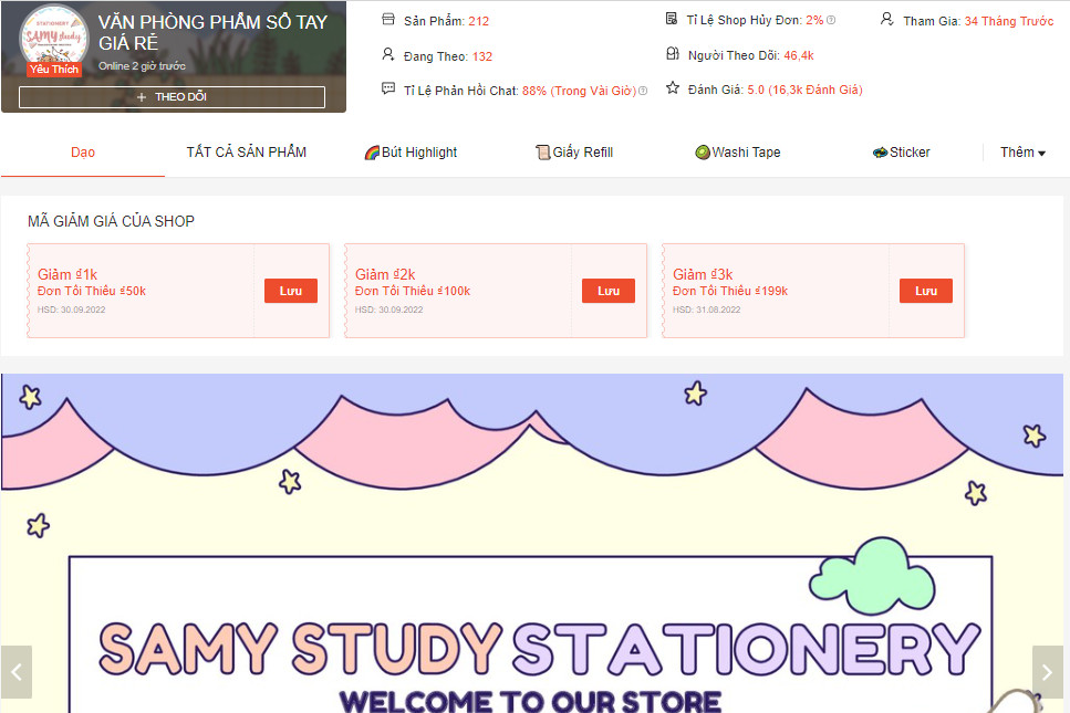 Văn phòng phẩm sổ tay giá rẻ hay được biết đến với cái tên Samy Study Stationery - 1 địa chỉ bán văn phòng phẩm online tại Đà Nẵng. Trước shopee đây là cái tên khá nổi trên Instagram - nền tảng chia sẻ hình ảnh dành cho các bạn trẻ. Tại đây shop sẽ bán chủ yếu là sổ tay các loại và bút nên sản phẩm sẽ không có nhiều như các shop trên. Nhưng bù lại về chất lượng không hề thua kém và giá cũng rẻ.
