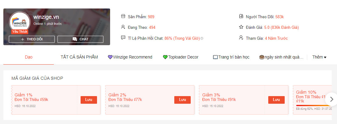 Với gần 900 sản phẩm các loại và đạt nửa triệu lượt theo dõi trên Shopee, winzige.vn có thể nói là shop bán đồ dùng học tập nổi bật nhất trong danh sách ngày hôm nay. Đây là 1 shop nội địa Trung có giá thành rẻ và mẫu mã vô cùng cute với nhiều loại đồ dùng khác nhau cho bạn lựa chọn.